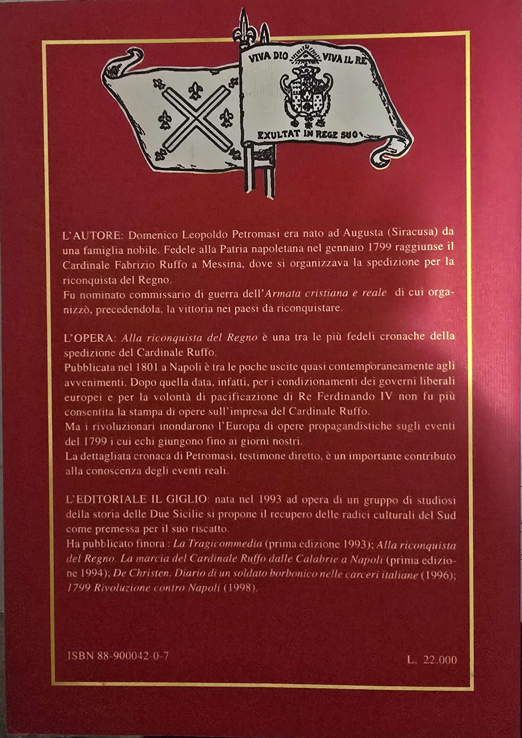 Una delle più fedeli cronache della spedizione intrapresa nel 1799 dal Cardinale Fabrizio Ruffo per riconquistare il Regno delle Due Sicilie, liberandolo dall’occupazione francese che aveva consentito ai giacobini napoletani di proclamare la repubblica. La cronaca della spedizione del Cardinale Ruffo, scritta da un testimone oculare, Domenico Petromasi, fu pubblicata per la prima volta nel 1801 ed è una delle poche opere che videro la luce all’epoca dei fatti. Dopo quella data, infatti, per i condizionamenti di alcuni governi liberali europei e per la volontà di pacificazione del re Ferdinando IV, non fu più consentita la stampa di opere sull’impresa. I rivoluzionari, viceversa, inondarono l’Europa di opere propagandistiche degli eventi del 1799, i cui echi giungono fino ai giorni nostri. La dettagliata cronaca di Petromasi è un importante contributo alla conoscenza degli eventi reali.