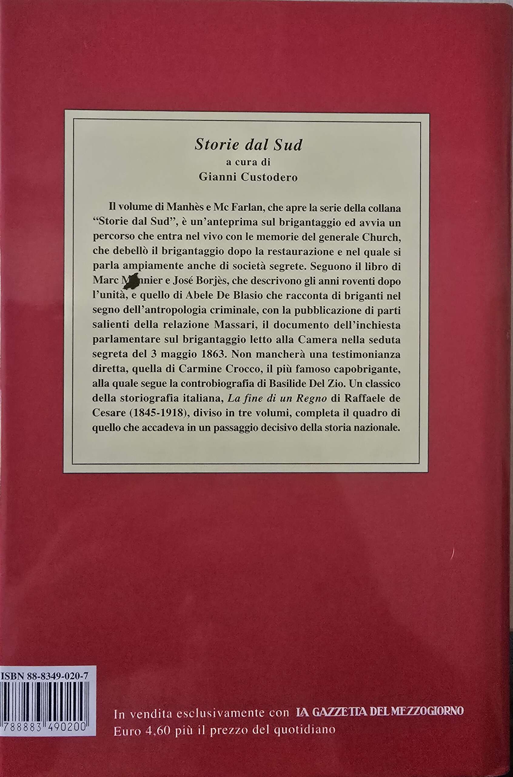 È un crescendo di nefandezze senza pari, scene raccapriccianti, da museo degli orrori: corpi squartati dai cavalli e teste mozzate portate in trofeo, deposte sulle tavole, “esposte con una pietra fra i denti% come poi riprenderà a fare la mafia. E l`incontro con personaggi che hanno avuto a che fare con la grande storia d`Italia, che spesso hanno trattato e patteggiato con i sovrani considerandosi loro pari. La rivoluzione del 1799 ed i Sanfedisti del cardinale Ruffo, Giuseppe Napoleone e Gioacchino Murat, Ferdinando IV ed i Savoia: tutti hanno avuto a che fare con il fenomeno del brigantaggio, tutti più o meno lo hanno avuto come strumento o hanno dovuto affrontarlo come problema. Incontriamo il Tasso e il Principe di San Severo (non dalla parte dei briganti ovviamente, ma da quella delle vittime), fra` Diavolo e Giosafatte Tallarico, il cabecilla José Borjès e Carmine Croceo, Ciro Annicchiarico e Ninco Nanco, Mammone e Coppolone: una galleria di bellimbusti che, comunque, appartengono alla storia del nostro bel paese.