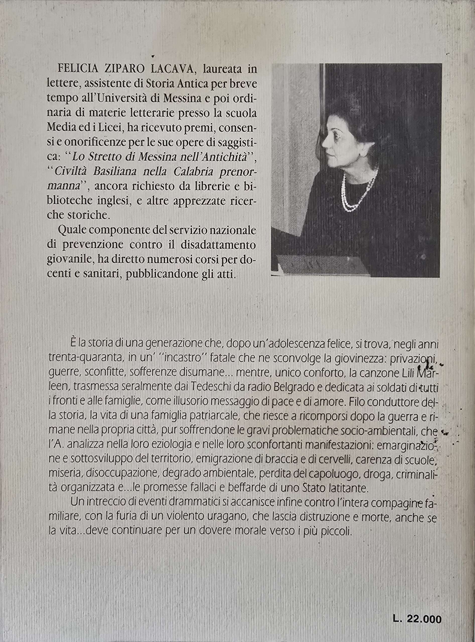 E’ un toccante e prezioso memoir che racconta l’esperienza dell’autrice, Felicia Ziparo Lacava, durante la Seconda Guerra Mondiale. Il titolo, evocativo e poetico, si riferisce alla celebre canzone “Lili Marleen”, un inno generazionale che univa soldati e civili di tutte le nazioni nel comune sentimento di nostalgia, paura e attesa che caratterizzò quel conflitto. . È un atto di amore verso la memoria e un dono alle generazioni future perché non dimentichino la realtà cruda della guerra, vissuta attraverso gli occhi di chi l’ha subita.
