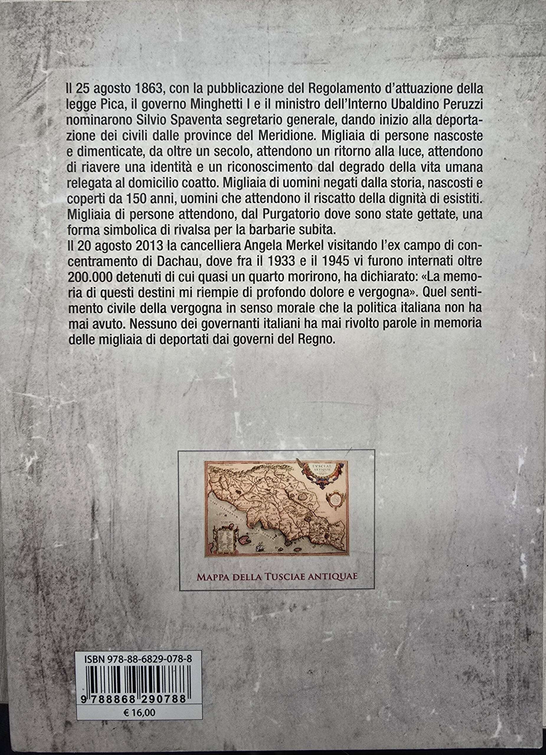 Il 25 agosto 1863, con la pubblicazione del Regolamento d’attuazione della legge Pica, il governo Minghetti I e il ministro dell’Interno Ubaldino Peruzzi nominarono Silvio Spaventa segretario generale, dando inizio alla deportazione dei civili dalle province del Meridione. Migliaia di persone nascoste e dimenticate, da oltre un secolo, attendono un ritorno alla luce, attendono di riavere una identità e un riconoscimento dal degrado della vita umana relegata al domicilio coatto. Migliaia di uomini negati dalla storia, nascosti e coperti da 150 anni, uomini che attendono il riscatto della dignità di esistiti. Migliaia di persone attendono, dal Purgatorio dove sono state gettate, una forma simbolica di rivalsa per la barbarie subita.