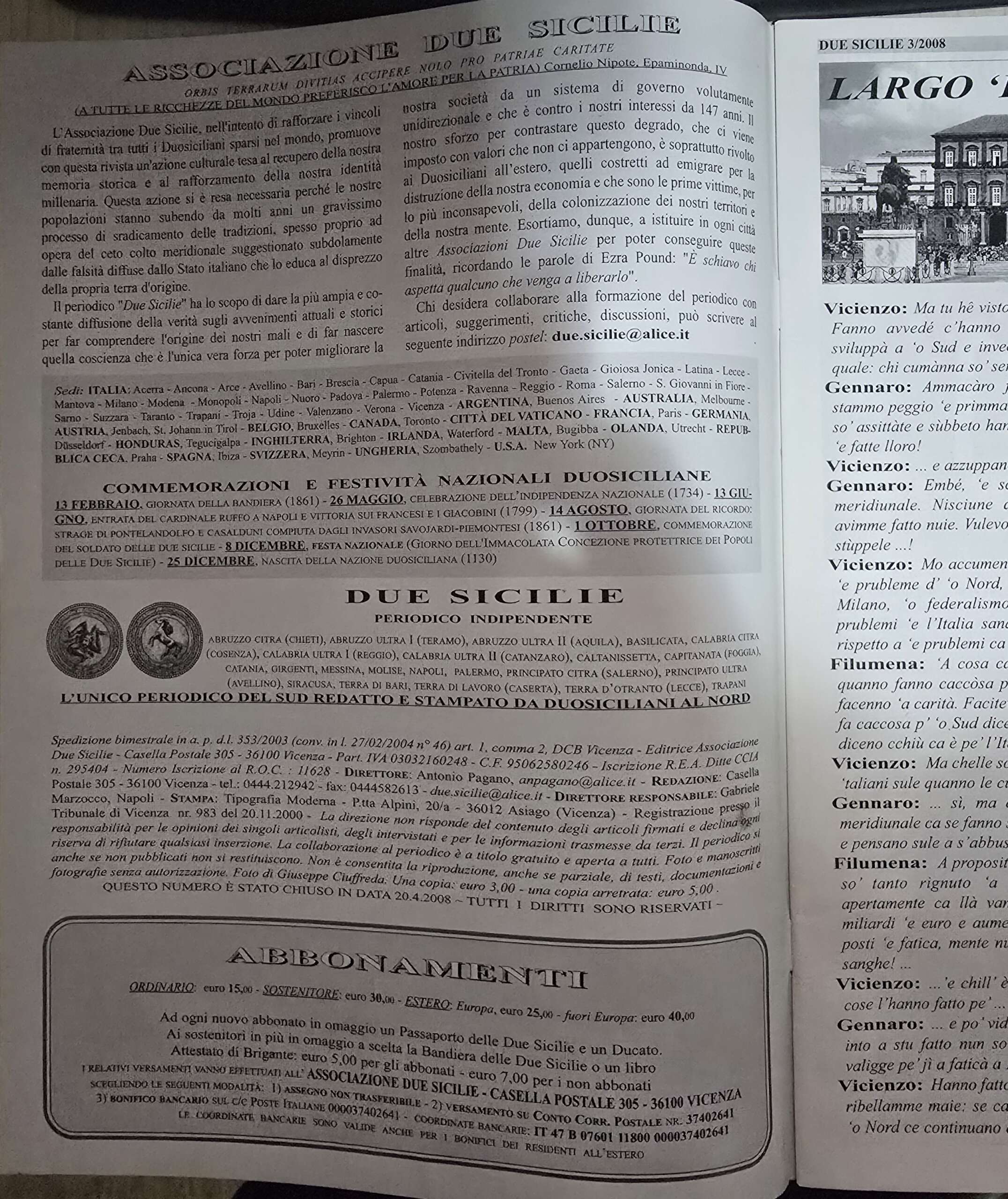 “La nostra Associazione, nell’intento di rafforzare i vincoli di fraternità tra tutti i Duosiciliani sparsi nel mondo, promuove un’azione culturale tesa al recupero della nostra memoria storica e al rafforzamento della nostra identità millenaria. Questa azione si è resa necessaria perché le nostre popolazioni stanno subendo da molti anni un gravissimo processo di sradicamento culturale, che per la maggior parte dipende proprio dal ceto colto del meridione italiano, molto spesso ostile ed educato dallo stesso Stato italiano sin dal 1860 al disprezzo della propria terra d’origine. Il periodico “Due Sicilie” è nato proprio per poter dare la piú ampia e costante diffusione dei fatti della nostra storia, soprattutto recente, per consentire di comprendere l’origine dei nostri mali attuali e di far nascere quella coscienza che è l’unica vera forza per poter migliorare la nostra società continuamente brutalizzata da un sistema ciecamente unidirezionale. Il nostro sforzo è soprattutto rivolto ai Duosiciliani emigrati, le prime vittime, per lo piú inconsapevoli, della subdola colonizzazione dei nostri territori. È necessario, tuttavia, che ognuno di noi si attivi per formare delle aggregazioni, altre associazioni culturali simili a questa, lontane da ogni colorazione politica, che moltiplichi i nostri sforzi per rendere fiera, dignitosa e unita la nostra gente, che solo così potrà contrastare quel degrado che ci viene imposto da valori che non ci appartengono. Scriveteci per ogni necessaria informazione.”