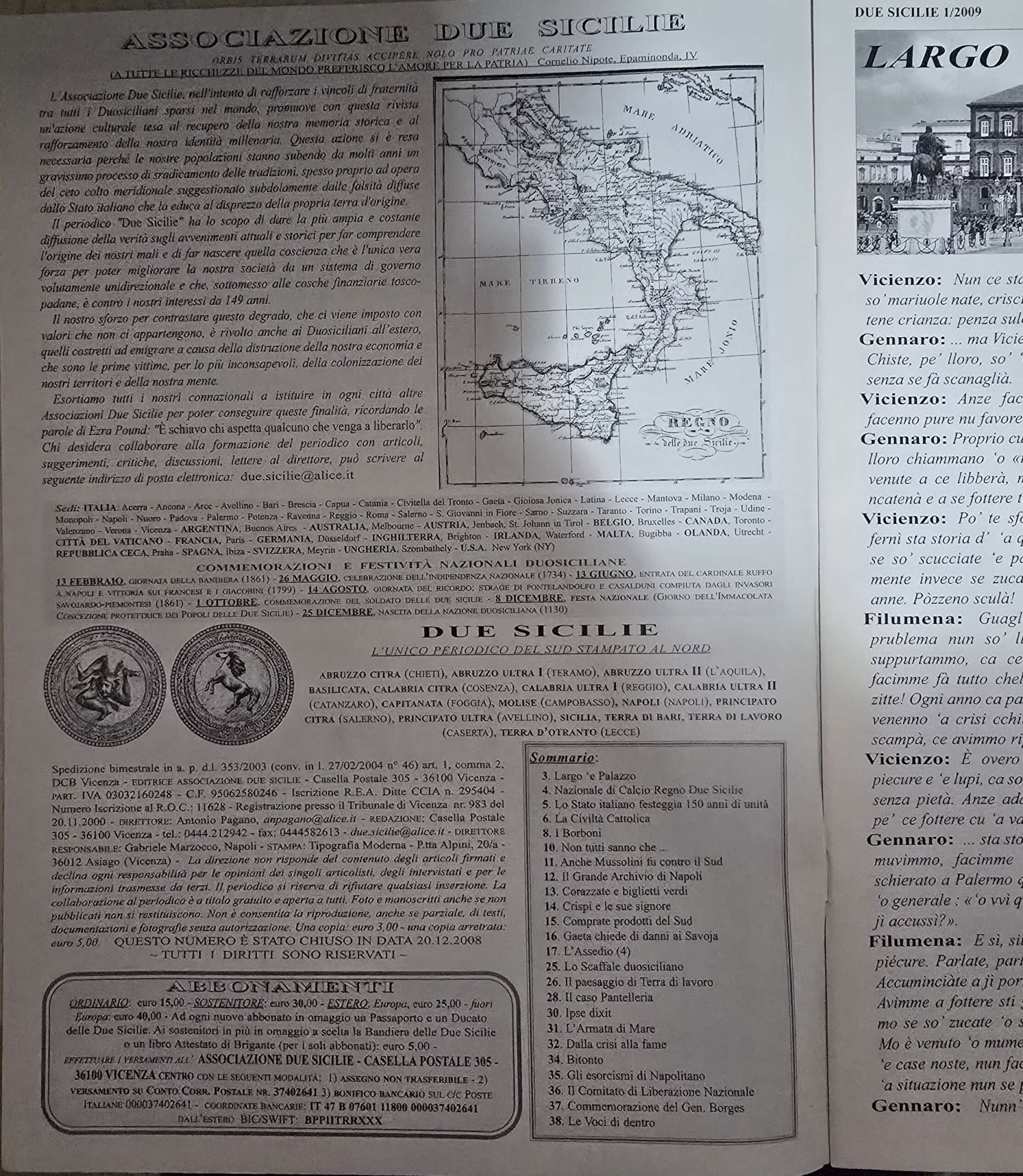 “La nostra Associazione, nell’intento di rafforzare i vincoli di fraternità tra tutti i Duosiciliani sparsi nel mondo, promuove un’azione culturale tesa al recupero della nostra memoria storica e al rafforzamento della nostra identità millenaria. Questa azione si è resa necessaria perché le nostre popolazioni stanno subendo da molti anni un gravissimo processo di sradicamento culturale, che per la maggior parte dipende proprio dal ceto colto del meridione italiano, molto spesso ostile ed educato dallo stesso Stato italiano sin dal 1860 al disprezzo della propria terra d’origine. Il periodico “Due Sicilie” è nato proprio per poter dare la piú ampia e costante diffusione dei fatti della nostra storia, soprattutto recente, per consentire di comprendere l’origine dei nostri mali attuali e di far nascere quella coscienza che è l’unica vera forza per poter migliorare la nostra società continuamente brutalizzata da un sistema ciecamente unidirezionale. Il nostro sforzo è soprattutto rivolto ai Duosiciliani emigrati, le prime vittime, per lo piú inconsapevoli, della subdola colonizzazione dei nostri territori. È necessario, tuttavia, che ognuno di noi si attivi per formare delle aggregazioni, altre associazioni culturali simili a questa, lontane da ogni colorazione politica, che moltiplichi i nostri sforzi per rendere fiera, dignitosa e unita la nostra gente, che solo così potrà contrastare quel degrado che ci viene imposto da valori che non ci appartengono. Scriveteci per ogni necessaria informazione.”