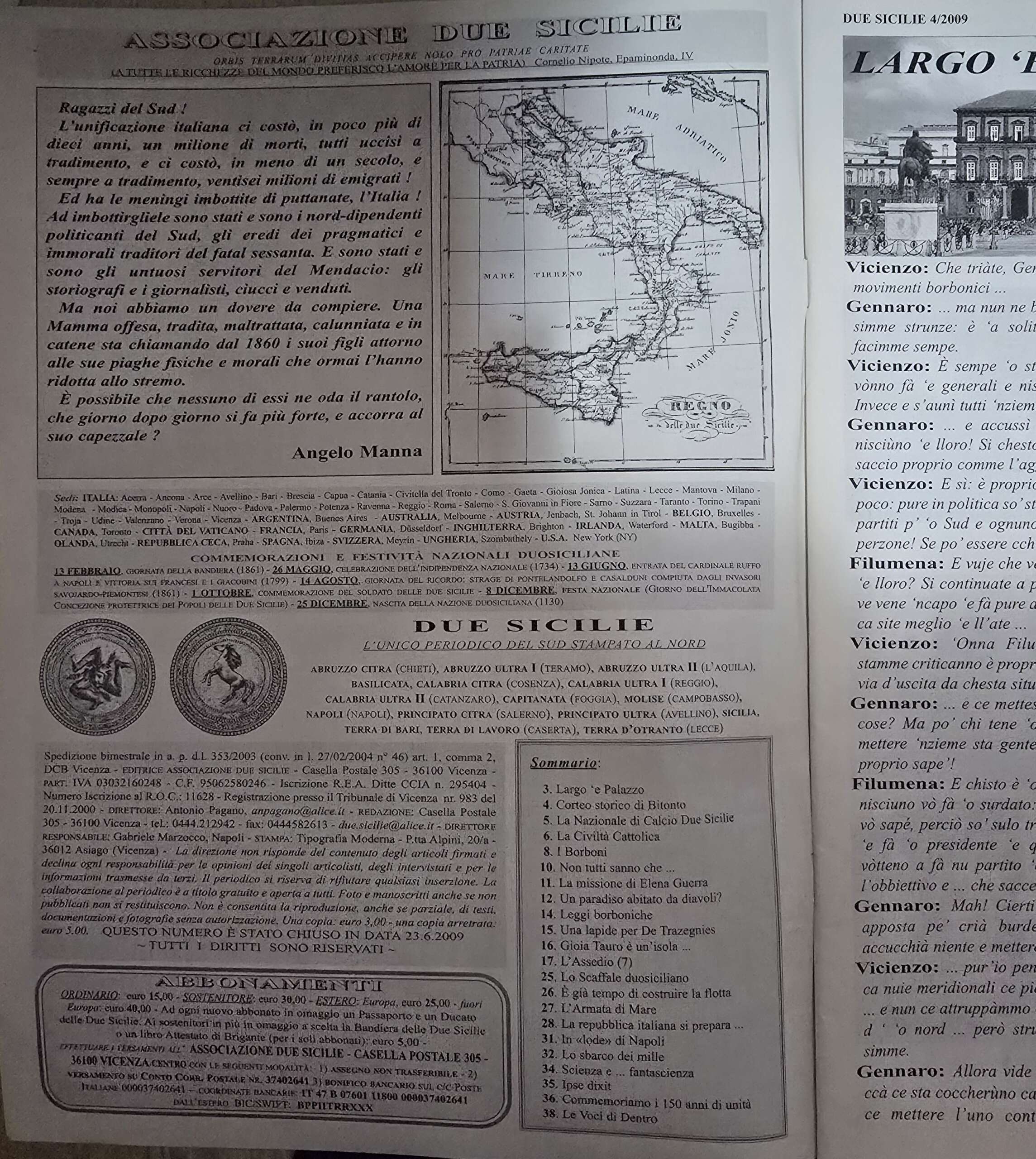 “La nostra Associazione, nell’intento di rafforzare i vincoli di fraternità tra tutti i Duosiciliani sparsi nel mondo, promuove un’azione culturale tesa al recupero della nostra memoria storica e al rafforzamento della nostra identità millenaria. Questa azione si è resa necessaria perché le nostre popolazioni stanno subendo da molti anni un gravissimo processo di sradicamento culturale, che per la maggior parte dipende proprio dal ceto colto del meridione italiano, molto spesso ostile ed educato dallo stesso Stato italiano sin dal 1860 al disprezzo della propria terra d’origine. Il periodico “Due Sicilie” è nato proprio per poter dare la piú ampia e costante diffusione dei fatti della nostra storia, soprattutto recente, per consentire di comprendere l’origine dei nostri mali attuali e di far nascere quella coscienza che è l’unica vera forza per poter migliorare la nostra società continuamente brutalizzata da un sistema ciecamente unidirezionale. Il nostro sforzo è soprattutto rivolto ai Duosiciliani emigrati, le prime vittime, per lo piú inconsapevoli, della subdola colonizzazione dei nostri territori. È necessario, tuttavia, che ognuno di noi si attivi per formare delle aggregazioni, altre associazioni culturali simili a questa, lontane da ogni colorazione politica, che moltiplichi i nostri sforzi per rendere fiera, dignitosa e unita la nostra gente, che solo così potrà contrastare quel degrado che ci viene imposto da valori che non ci appartengono. Scriveteci per ogni necessaria informazione.”