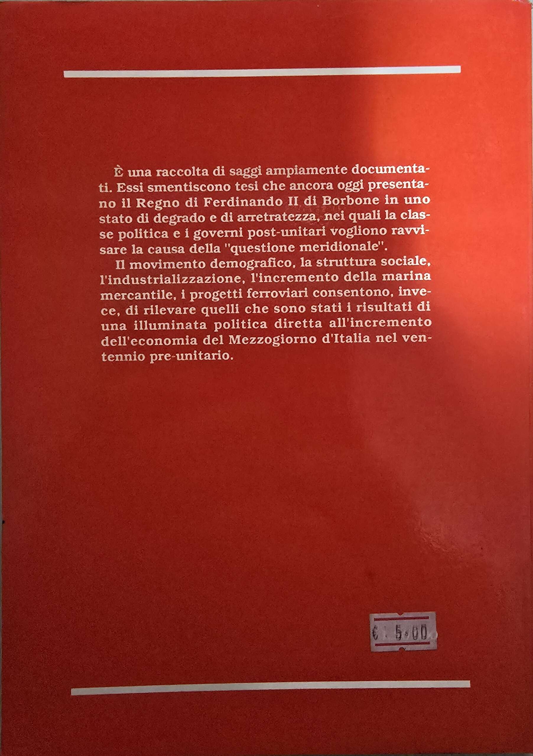 Il movimento demografico, la struttura sociale, l’industrializzazione, l’incremento della marina mercantile, i progetti ferroviari consentono, invece, di rilevare quelli che sono stati i risultati di una illuminata politica diretta all’incremento dell’economia del Mezzogiorno d’Italia nel ventennio pre-unitario. Presentazione di Santino Bonsera