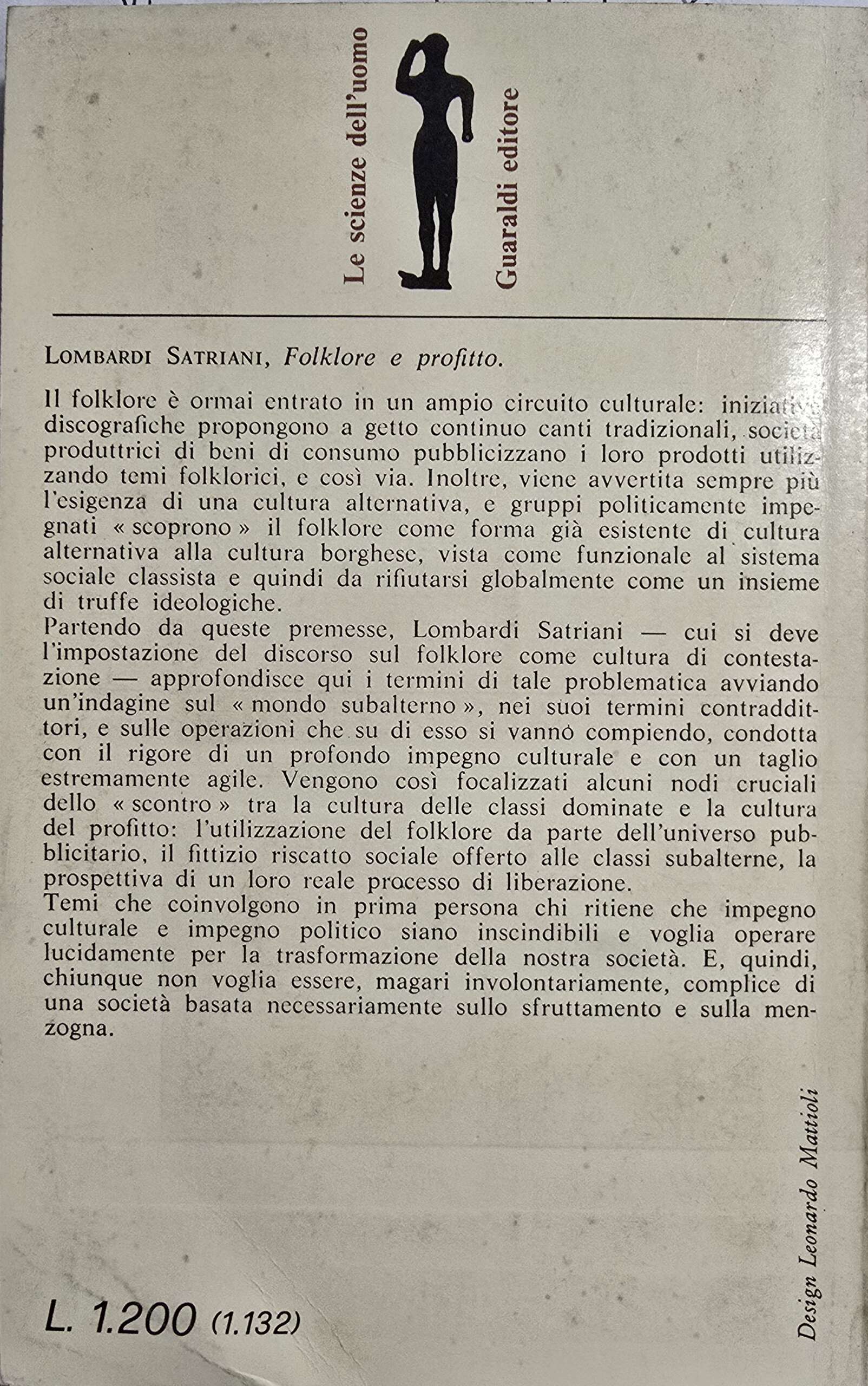 Folklore e profitto, apparso per la prima volta nel 1973, ripensa in modo critico e fine le dicotomie gramsciane di “popolare”, “subalterno” ed “egemone”, ma soprattutto, con uno scatto di grande modernità e libertà dagli schemi disciplinari e ideologici del tempo, osserva il cortocircuito di queste categorie nello spazio mediatico nazionale del periodo.Luigi Maria Lombardi Satriani di Porto Salvo (Briatico, 10 dicembre 1936 – Roma, 30 maggio 2022) è stato un antropologo e politico italiano, già senatore della Repubblica Italiana.