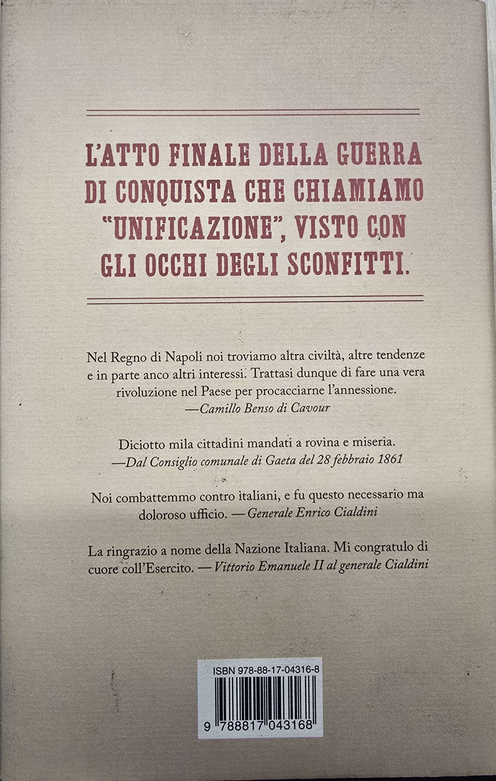 La sera del 6 settembre 1860, all’avvicinarsi delle truppe garibaldine, il re Francesco II di Borbone lascia Napoli con la sua corte e si stabilisce nella roccaforte di Gaeta, facendone la sua capitale. Dopo l’incontro di Teano tra Garibaldi e Vittorio Emanuele II, manca solo Gaeta per completare l’annessione del Sud a quello che sta per diventare il regno d’Italia. Così il 5 novembre le truppe piemontesi, guidate dal generale Cialdini, stringono d’assedio la città. È un attacco brutale, che porta alla morte di migliaia e migliaia di militari e civili a causa delle cannonate e dell’epidemia di tifo scoppiata per le precarie condizioni igieniche. Gigi Di Fiore lo ricostruisce sulla base di documenti e testimonianze inedite, e mette in risalto le contraddizioni (e le sopraffazioni) su cui si fonda la nostra unità nazionale.
