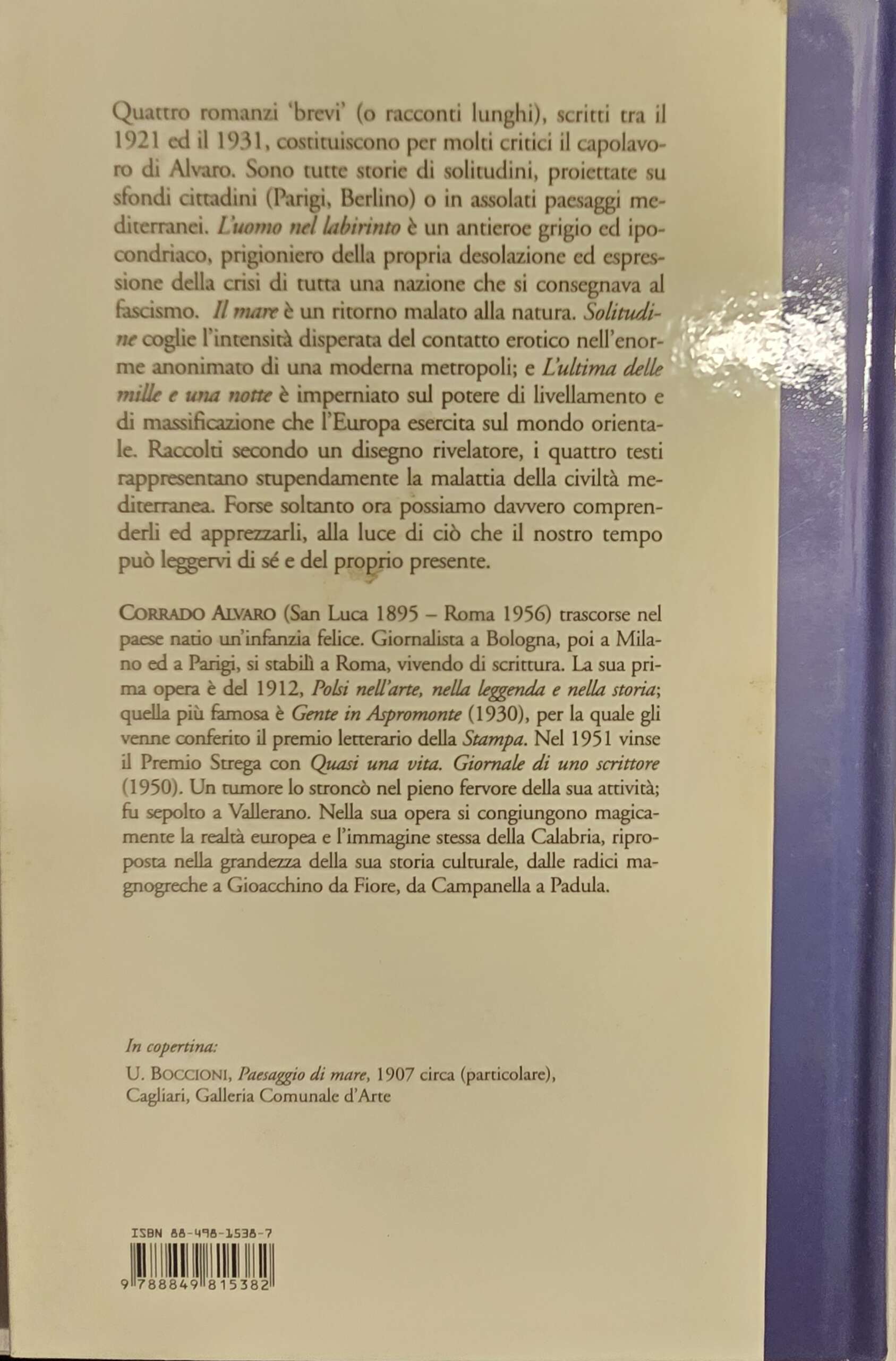 Quattro romanzi ‘brevi’ (o racconti lunghi), scritti tra il 1921 ed il 1931, costituiscono per molti critici il capolavoro di Alvaro. Sono tutte storie di solitudini, proiettate su sfondi cittadini (Parigi, Berlino) o in assolati paesaggi mediterranei. L’uomo nel labirinto è un antieroe grigio ed ipocondriaco, prigioniero della propria desolazione ed espressione della crisi di tutta una nazione che si consegnava al fascismo. Il mare è un ritorno malato alla natura. Solitudine coglie l’intensità disperata del contatto erotico nell’enorme anonimato di una moderna metropoli; e L’ultima delle mille e una notte è imperniato sul potere di livellamento e di massificazione che l’Europa esercita sul mondo orientale. Raccolti secondo un disegno rivelatore, i quattro testi rappresentano stupendamente la malattia della civiltà mediterranea. Forse soltanto ora possiamo davvero comprenderli ed apprezzarli, alla luce di ciò che il nostro tempo può leggervi di sé e del proprio presente.