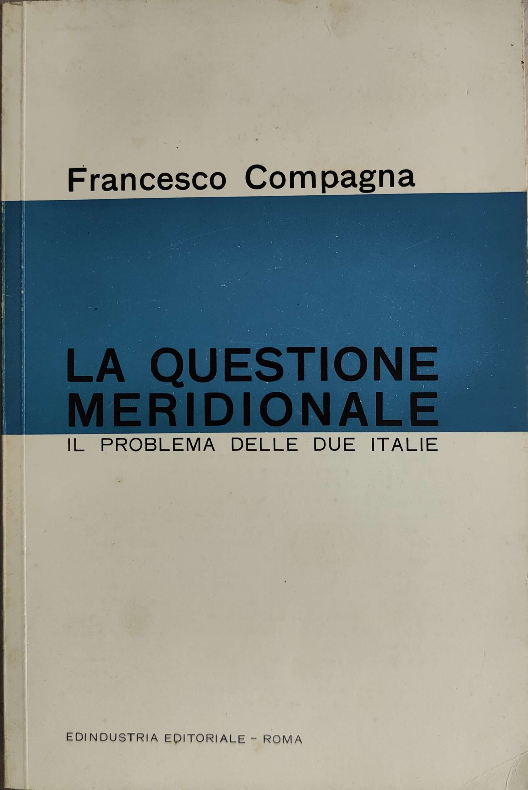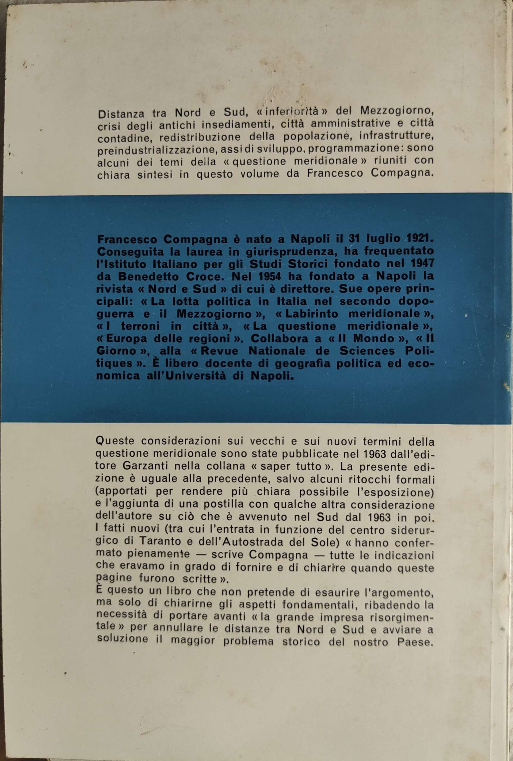 “Distanza tra Nord e Sud,”inferiorità” del mezzogiorno, crisi degli antichi insediamenti, città amministrative e città contadine, redistribuzione della popolazione, infrastrutture, preindustrializzazione, assi di sviluppo, programmazione; sono alcuni dei temi della “questione meridionale” riuniti con chiara sintesi in questo volume di Francesco Compagna”.