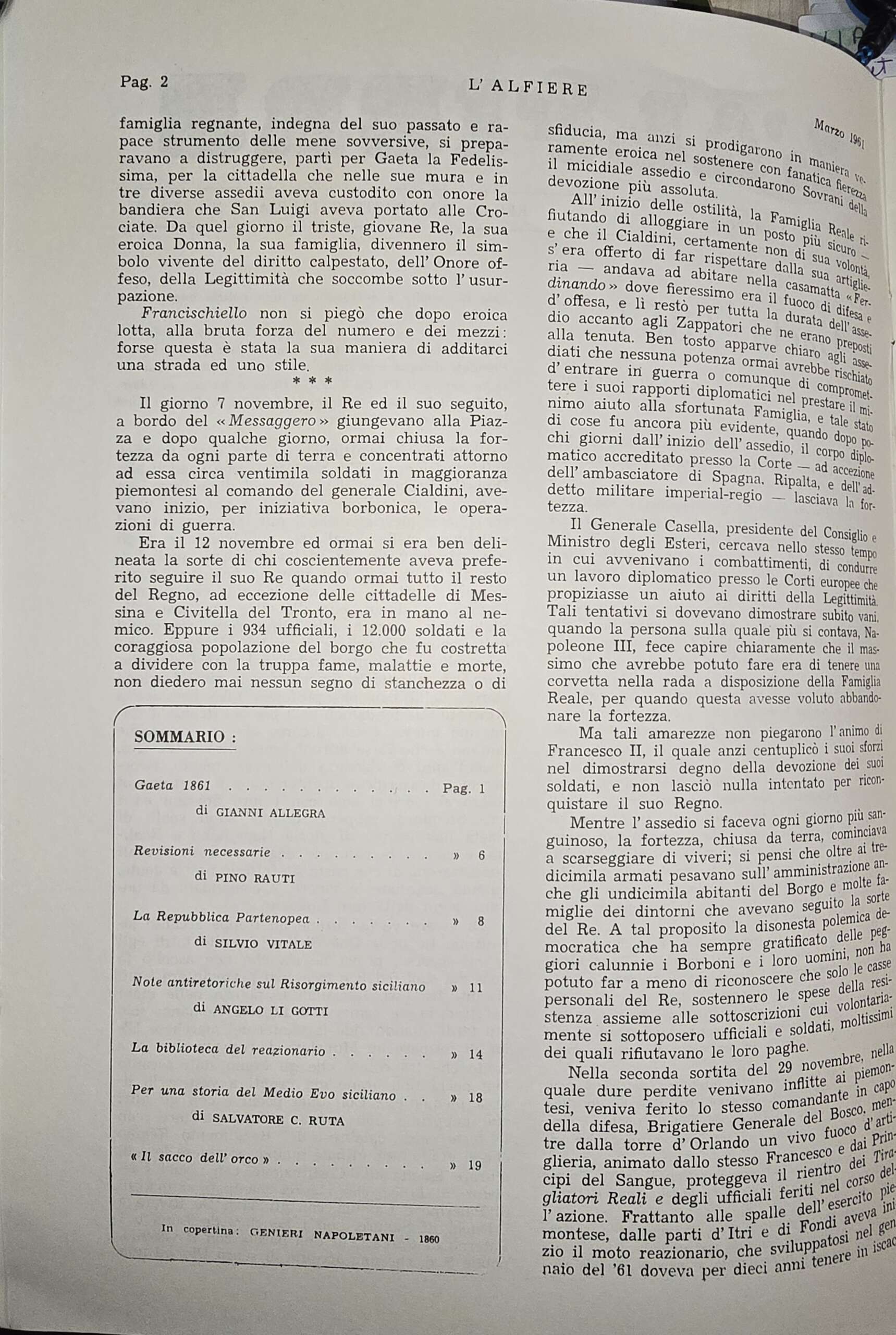 Autorevole punto di riferimento per il mondo tradizionalista meridionale e non, la rivista per prima intraprese la difficile strada del recupero delle fonti storiche per una rilettura critica della vicenda risorgimentale, in netto contrasto con la retorica storiografica rinnovata dal centenario dell’unificazione d’Italia, allora appena celebrato.