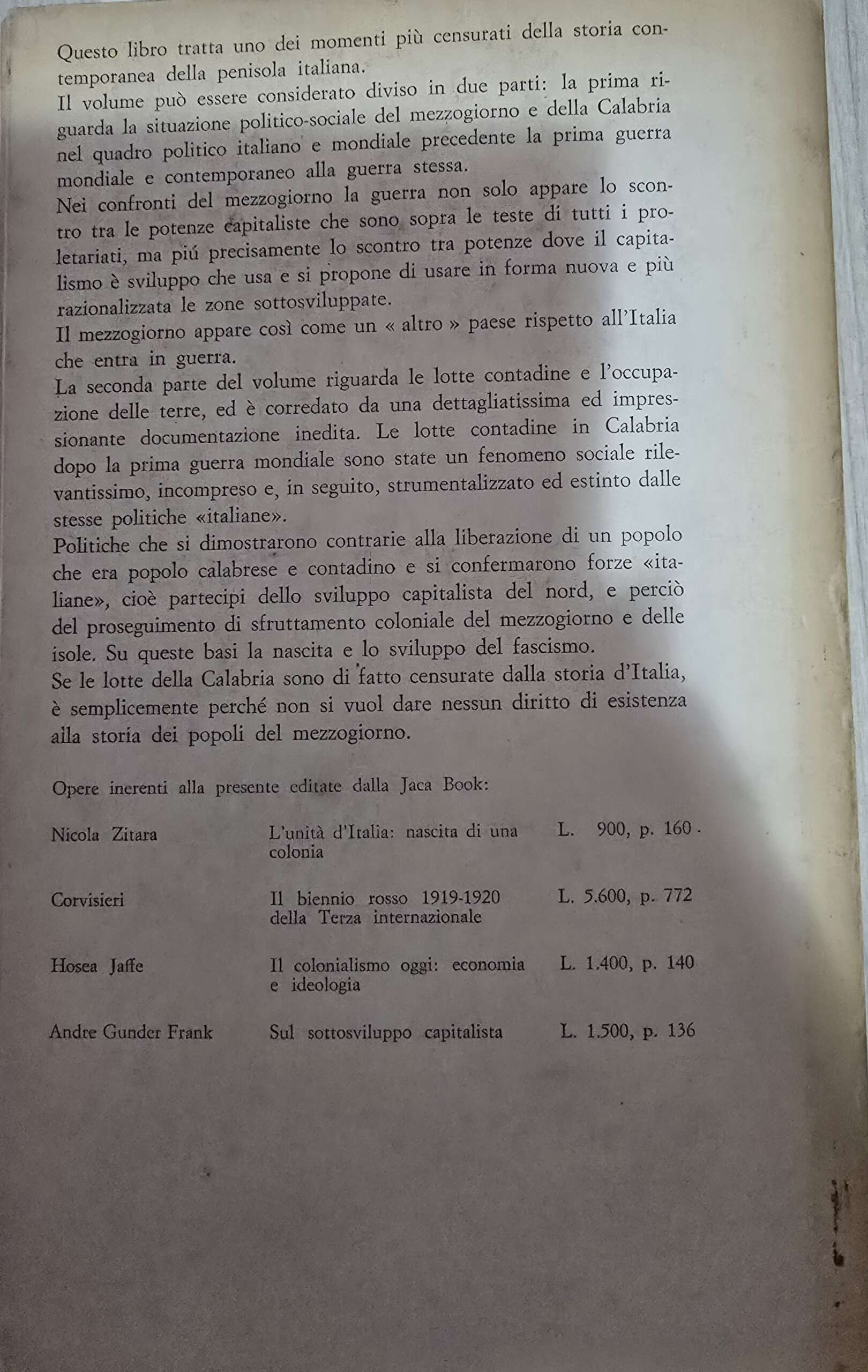 Il saggio di Enzo Misèfari ricostruisce con rigore storico e partecipazione civile le vicende delle masse rurali calabresi tra la Prima guerra mondiale e l’avvento del fascismo. Attraverso documenti, cronache e testimonianze, l’autore illumina le condizioni di vita dei contadini, le lotte per la terra e la nascita di una coscienza sociale e politica nel Mezzogiorno. Lontano da ogni folclorismo, Misèfari restituisce dignità e voce a un popolo che, nella povertà e nella resistenza quotidiana, seppe porre le basi di una nuova consapevolezza collettiva. Un testo essenziale per comprendere le radici della questione meridionale.