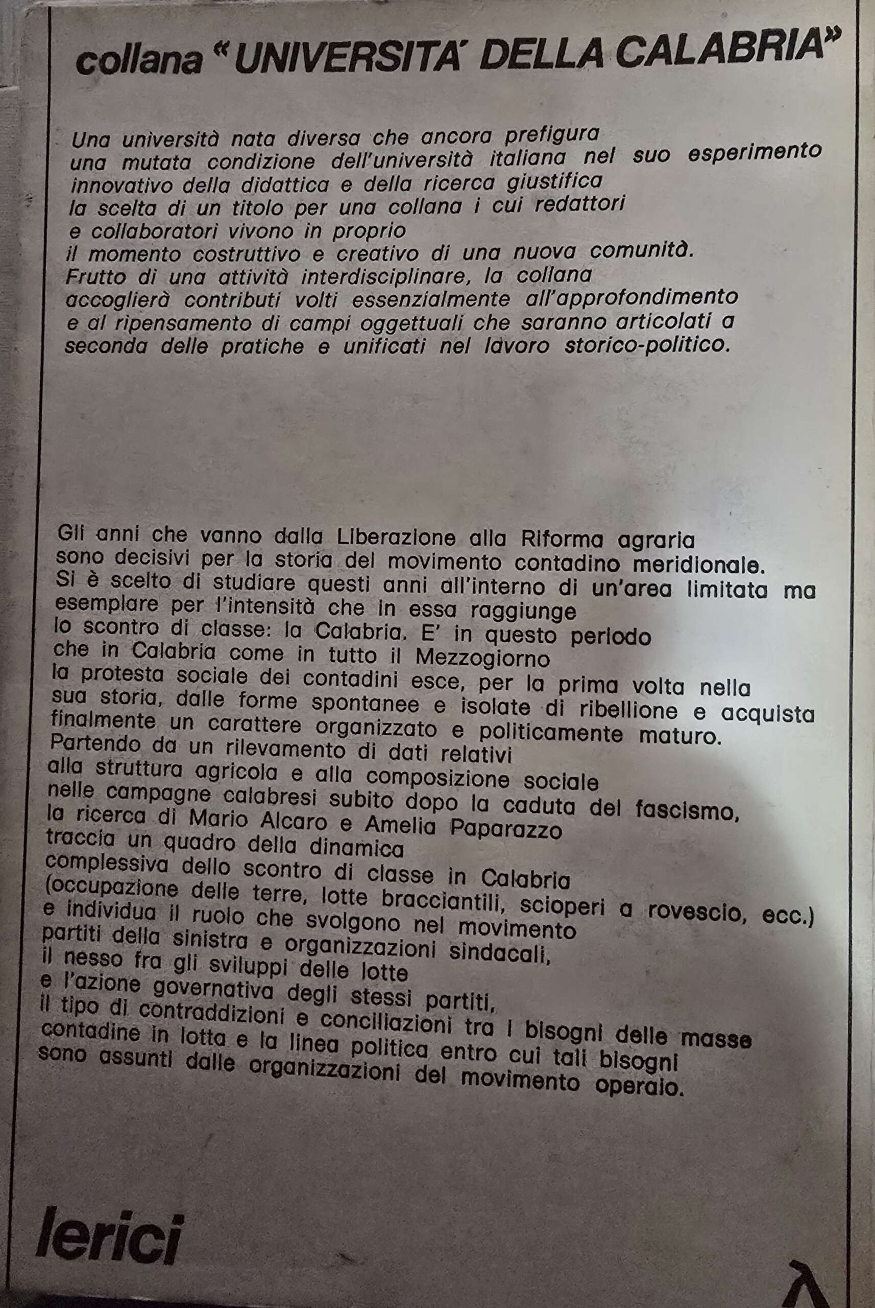 Pubblicato nel 1976 da Lerici Editore, questo volume è uno studio storico-politico che analizza le lotte contadine nella Calabria del secondo dopoguerra, con un taglio critico e militante. Gli autori, entrambi legati all’Università della Calabria, offrono una lettura profonda e articolata di un periodo cruciale per il Mezzogiorno italiano. Il libro documenta le occupazioni delle terre, le rivendicazioni dei braccianti e le mobilitazioni popolari tra il 1943 e il 1950. Viene analizzata l’azione del Partito Comunista Italiano, che secondo gli autori ha incanalato le lotte in una direzione riformista, limitandone il potenziale rivoluzionario. L’opera interpreta le lotte come espressione di una tensione profonda tra proletariato rurale e borghesia terriera, con implicazioni nazionali e ideologiche.