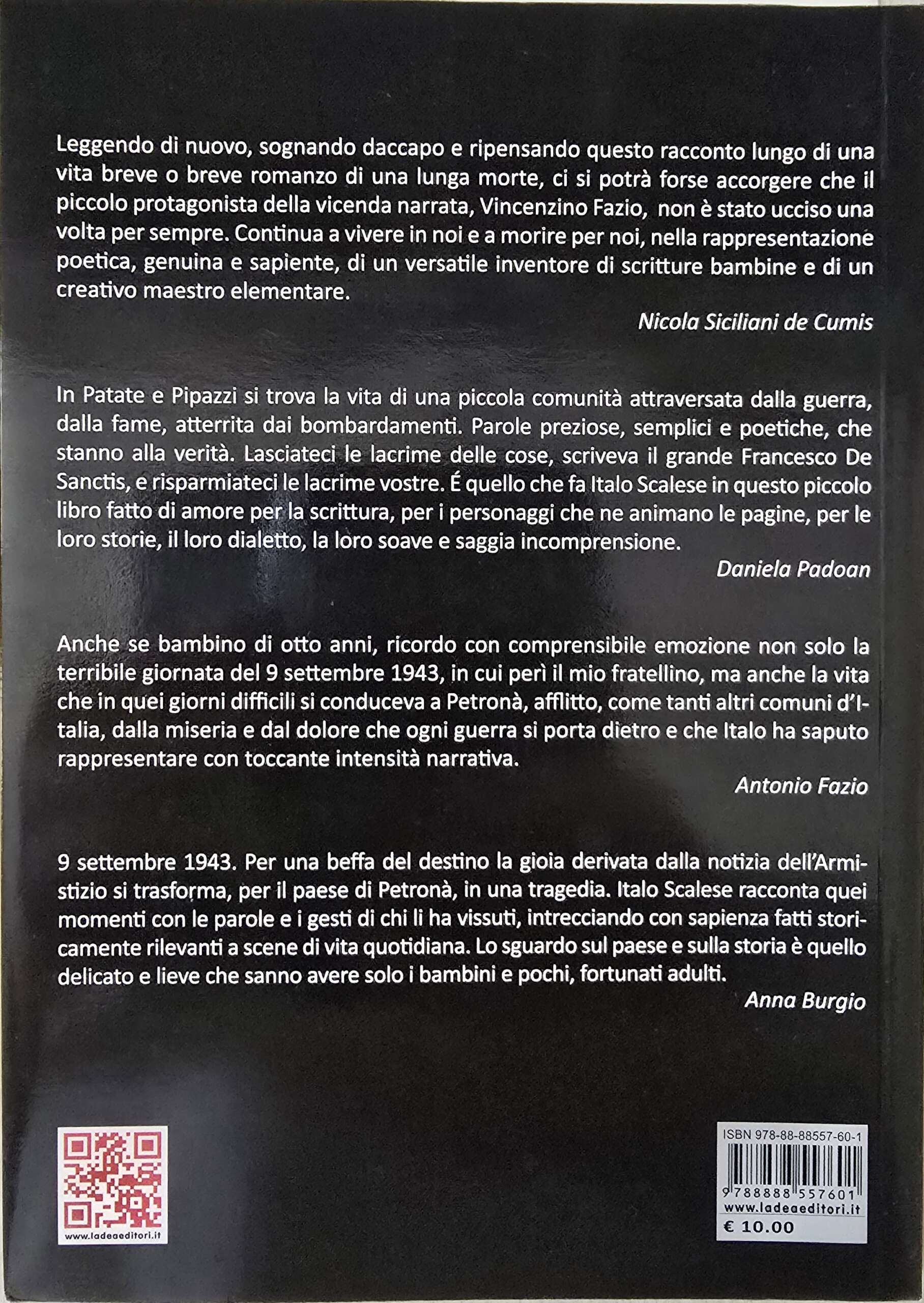 Romanzo breve ma intenso, che mescola memoria storica, tradizione popolare e sensibilità narrativa. Il titolo richiama un piatto tipico calabrese ma il contenuto va ben oltre la cucina: è una storia di guerra, di infanzia e di tragedia, ambientata nel piccolo paese di Petronà, in provincia di Catanzaro. Il romanzo è ambientato il 9 settembre 1943, giorno successivo all’Armistizio. Patate e Pipazzi è una “storia con la esse minuscola”, come la definisce l’autore: una vicenda locale che illumina il dramma universale della guerra e della perdita