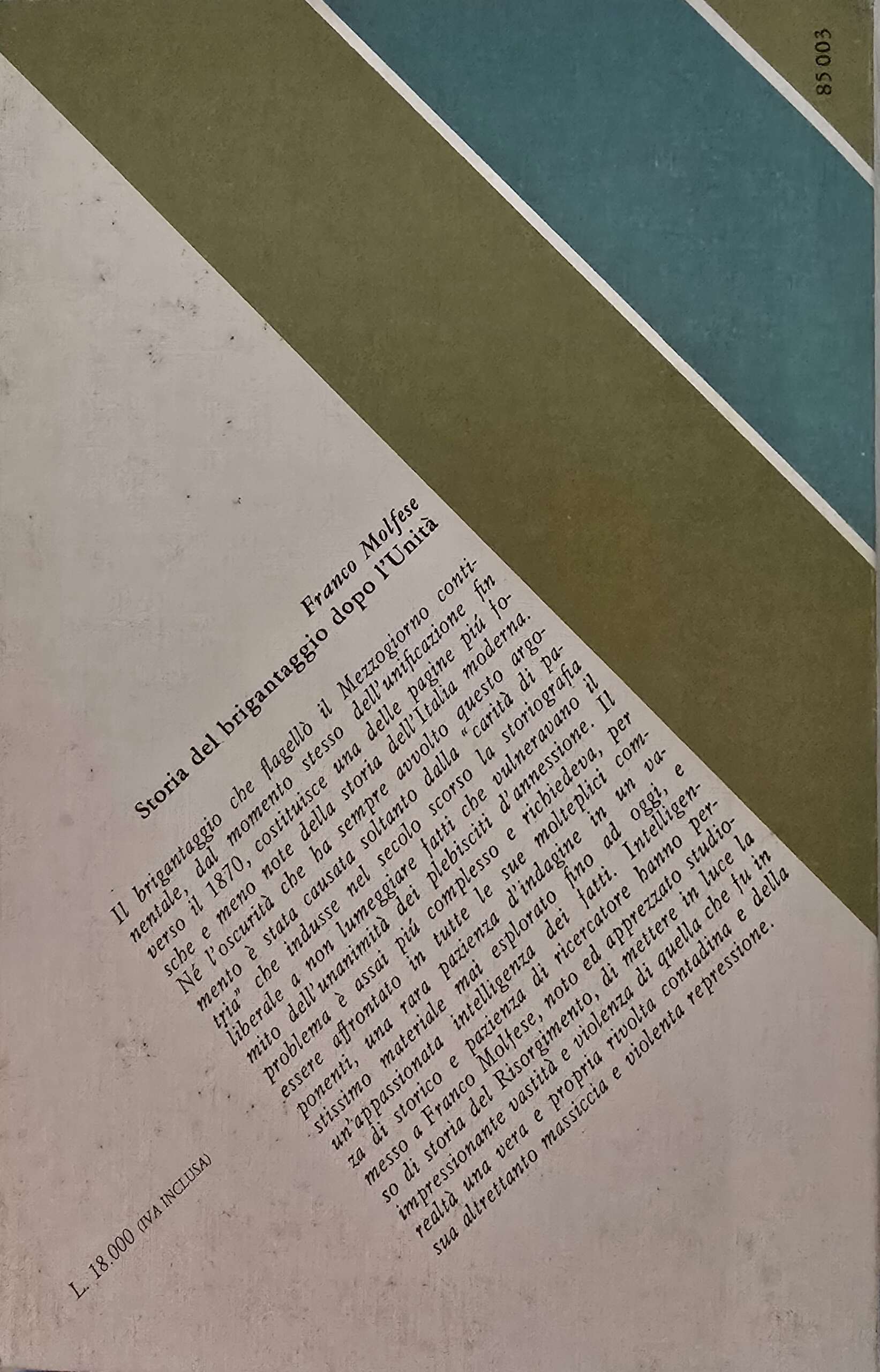 Uno dei saggi più importanti e significativi di storia del brigantaggio postunitario è quello di Franco Molfese, Storia del brigantaggio dopo l’Unità, pubblicato nel 1964, che è rimasto per alcuni decenni il testo di riferimento sul tema. Il Molfese compì un lungo lavoro di ricerca, durato molti anni, esaminando una grande massa di fonti. Egli consultò documenti d’archivio, memorie, epistolari e carteggi, cronache locali, biografie di singoli briganti, monografie su vicende specifiche etc. in grande abbondanza. Inoltre riprese buona parte dei principali studiosi anteriori del “grande brigantaggio”. Il risultato fu una summa di quanto era stato scritto sino ad allora sul brigantaggio postunitario, che forniva un quadro organico della sua storia con dovizia di dati ordinati in modo rigoroso e coerente.