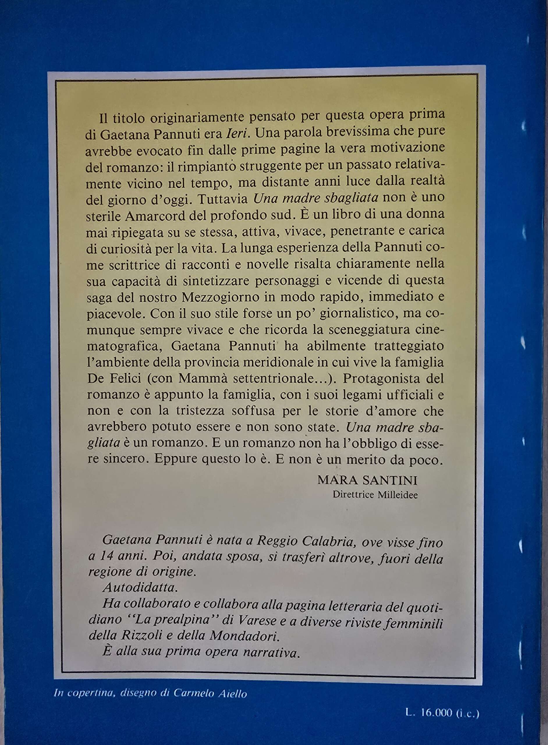 Il titolo originariamente per pensato per quest’opera prima di Gaetana Pannuti era “ieri”. Una parola brevissima che pure avrebbe evocato fin dalle prime pagine la vera motivazione del romanzo: il rimpianto struggente per un passato relativamente vicino nel tempo ma distante anni luce dalla realtà del giorno d’oggi. Protagonista del romanzo è la famiglia, con i suoi legami ufficiali e non e con la tristezza soffusa per le storie d’amore che avrebbero potuto essere e non sono state. “Una madre sbagliata” è un romanzo e un romanzo non ha l’obbligo di essere sincero. Eppure questo lo è. E non è un merito da poco.